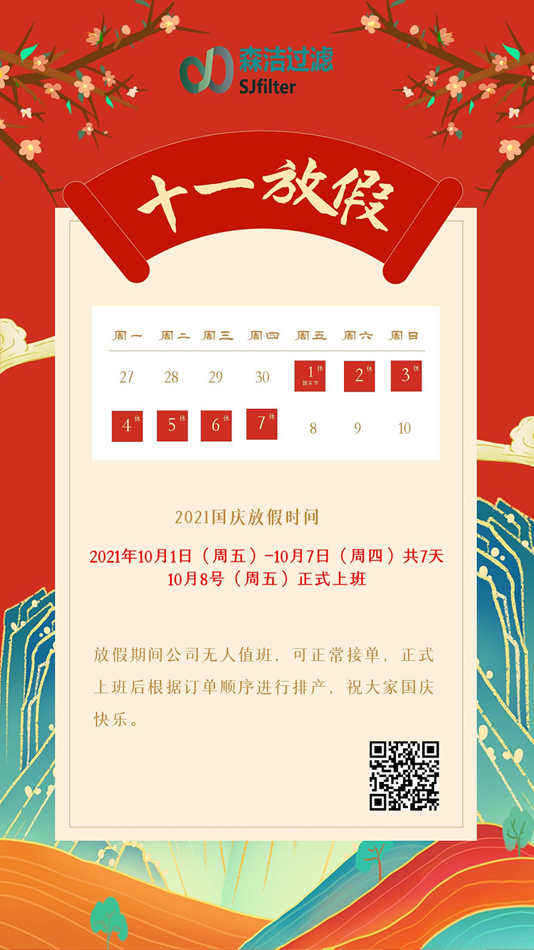 森潔過濾全體員工將有10.1(周五)-10.7(周四)開啟國慶假期,10.8(周五)正式上班,假期期間只接單不發(fā)貨,所有訂單正式開工后按順序發(fā)出